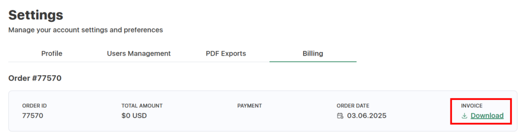 Clicking on View next to your active subscription will provide you with an overview of all the details associated with your subscription, including your Billing History, which is where you can download your invoices.