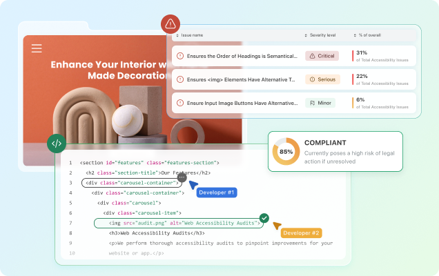 Manage accessibility with AI-powered ongoing support (you control deployment), clear code-level fix instructions for developers, and guided manual WCAG audits (done by your team or with our experts).